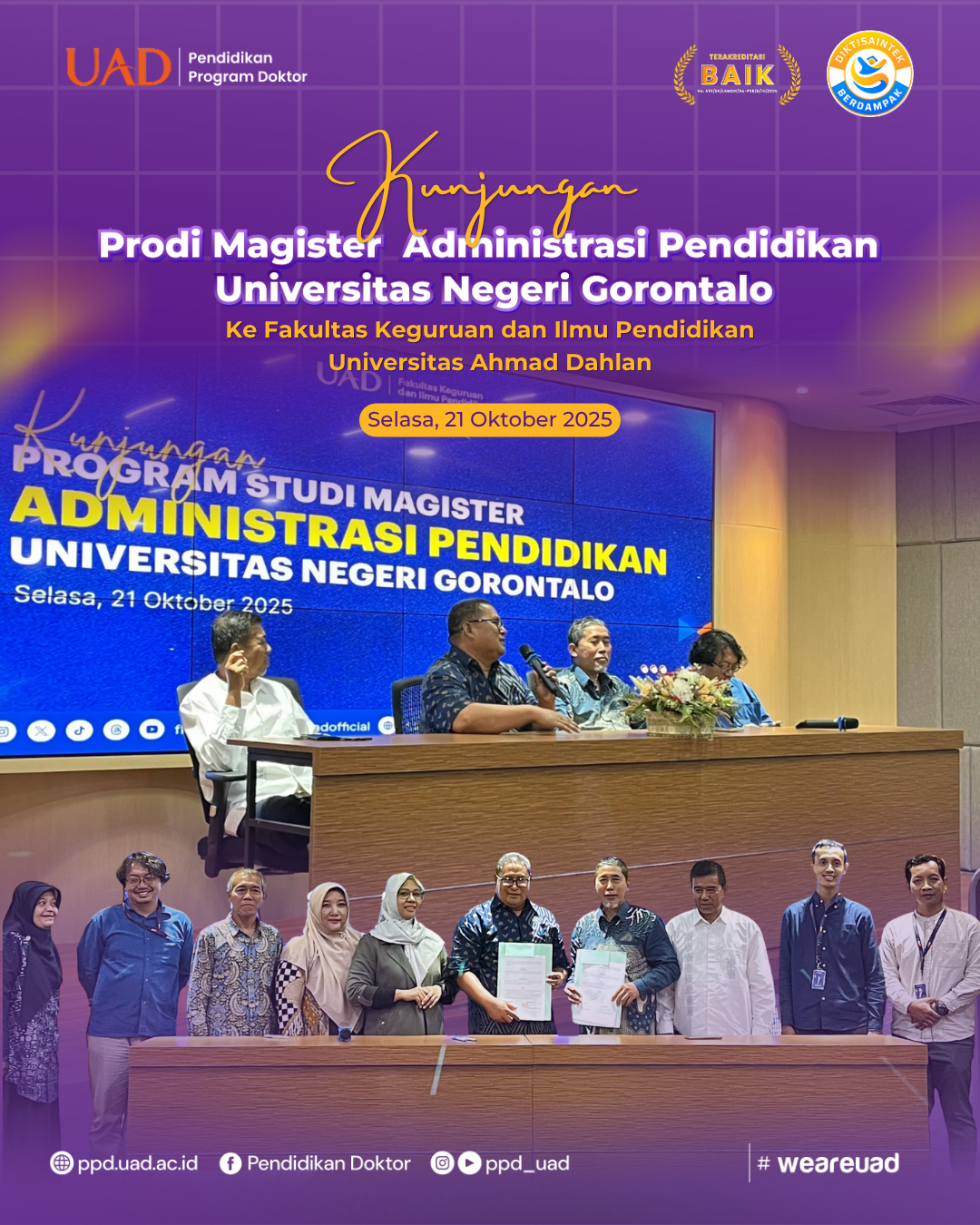 Yogyakarta, 21 Oktober 2025 — Fakultas Keguruan dan Ilmu Pendidikan (FKIP) Universitas Ahmad Dahlan (UAD) menerima kunjungan dari Program Studi Magister Administrasi Pendidikan Universitas Negeri Gorontalo (UNG). Kegiatan ini dilaksanakan pada Selasa, 21 Oktober 2025, bertempat di Kampus UAD Yogyakarta, dengan tujuan mempererat kerja sama akademik dan pengembangan kelembagaan antarperguruan tinggi.