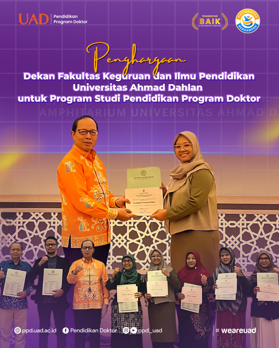 Program Doktor Pendidikan UAD selama ini dikenal sebagai salah satu pusat pengembangan ilmu pendidikan yang aktif dalam kegiatan penelitian berbasis inovasi dan nilai-nilai keislaman. Melalui kolaborasi lintas institusi dan berbagai publikasi ilmiah bereputasi, program ini berhasil menunjukkan kontribusi nyata terhadap kemajuan ilmu pengetahuan, khususnya dalam bidang pendidikan di Indonesia.