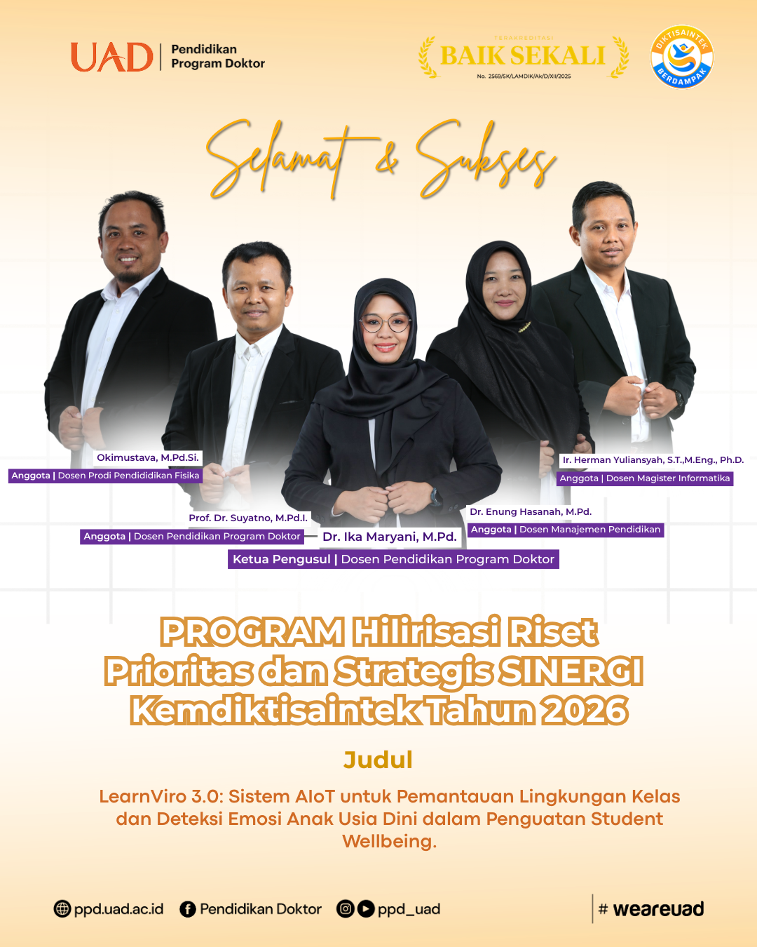 Kabar baik datang dari Program Studi Pendidikan Program Doktor FKIP Universitas Ahmad Dahlan (UAD). Salah satu tim dosennya berhasil meraih pendanaan dari Program Hilirisasi Riset Prioritas dan Strategis (SINERGI) Tahun 2026 dari Kementerian Pendidikan Tinggi, Sains, dan Teknologi RI. Tim ini diketuai oleh Dr. Ika Maryani, M.Pd. yang juga menjabat sebagai Sekretaris Prodi, dengan mengusung riset berjudul “LearnViro 3.0: Sistem AIoT untuk Pemantauan Lingkungan Kelas dan Deteksi Emosi Anak Usia Dini dalam Penguatan Student Wellbeing.”